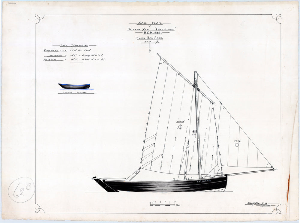 Scale 1:24. A plan showing the sail arrangement of the Gratitude BCK252 (no date), a scaffie. The plan has been signed 'P J Oke, Plymouth' and is dated May 1936.