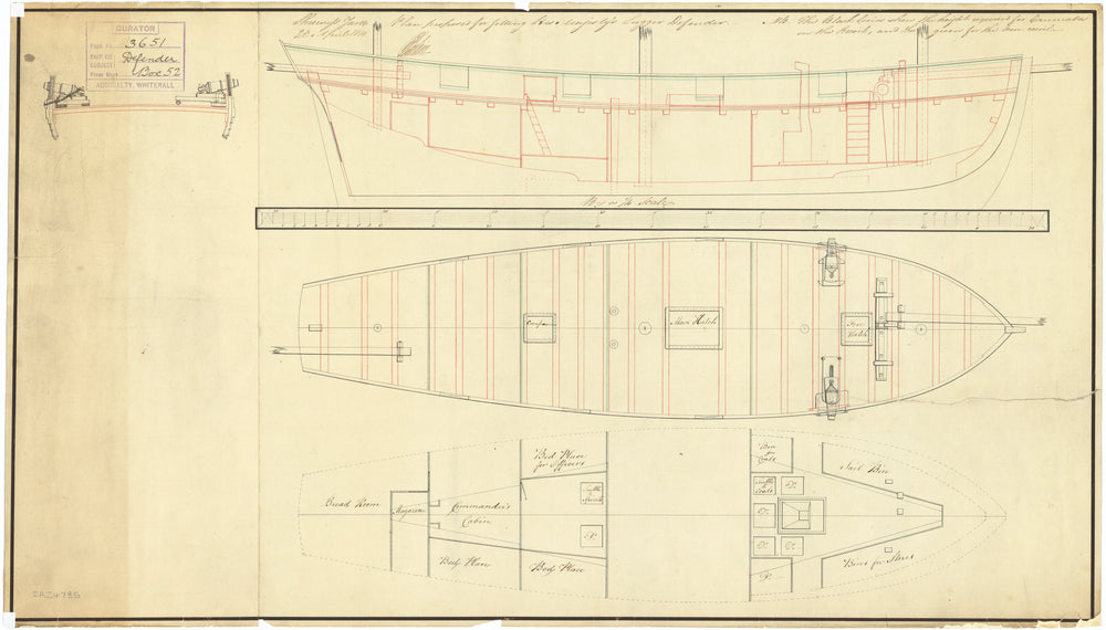 Scale: 1:48. Plan showing the inboard profile, upper deck, section, and fore & aft platform as proposed for fitting Defender (captured 1809), a captured French lugger, at Sheerness as an 8-gun lugger with recoil or non-recoil carronades.. The section illustrates the carronades.